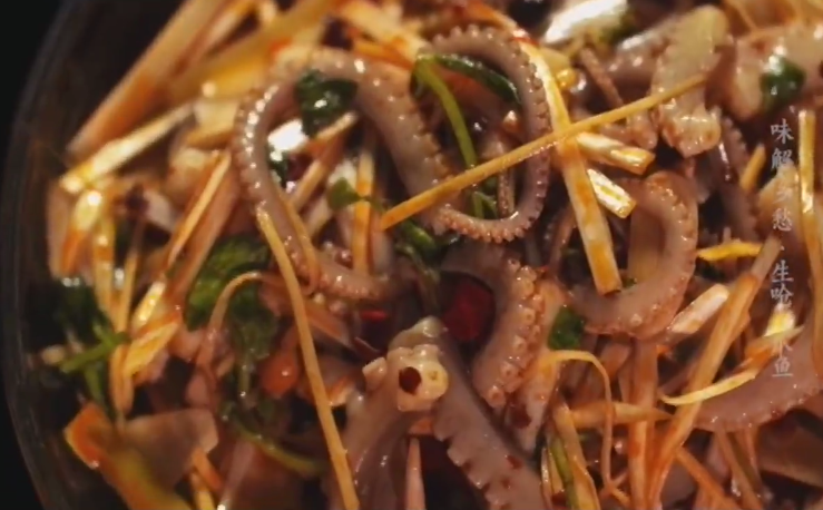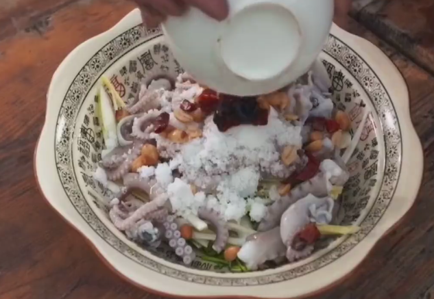 連云港特色美食“生嗆八爪魚”的制作過程十分簡單:先將八爪魚內(nèi)臟掏空洗干凈,然后改刀,接著將改完刀的八爪魚汆水,待八爪魚七成熟時撈出,撈出的八爪魚將迅速被放入冰水中。緊接著在冰鎮(zhèn)過后的八爪魚中加入調(diào)料,最后放入切好的蔬菜涼拌。