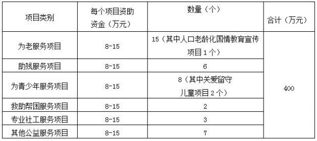 本次公益創(chuàng)投活動將按照6大類申報(每個項目資助金額平均8-15萬元左右),各項目實施主體根據項目規(guī)模、效益和投入等合理申報。社會組織應積極開辟渠道自籌資金。項目資助資金根據最終核定的金額撥付。具體分配情況明細如下: